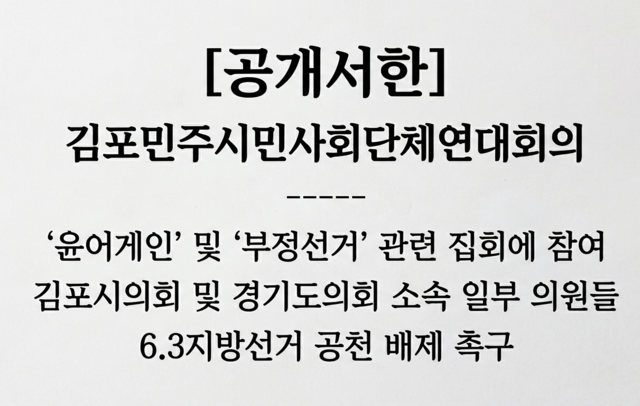 김포민주시민사회단체연대회의는 9일 공개서한을 통해 김포시의회 및 경기도의회 소속 일부 의원들이 이른바 ‘윤어게인’ 및 ‘부정선거’ 집회에 참여한 행위를 두고 “민주주의를 부정하는 반민주적 행태”라고 규정하며 공천 배제를 촉구하고 나섰다.