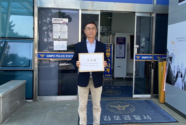 ![]() ▲ 정하영 김포시장 예비후보가 김포경찰서 민원실 앞에서 고소장을 들고 있다. |