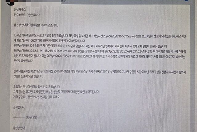 이에 대해 A지역언론사는 기사 작성 시간과 실제 공개 시간이 다른 시스템 구조를 설명하며 “2026년 4월 20일 오후 4시55분경 기사 작성이 시작됐고, 이후 오후 8시52분까지 동일 IP의 내부 접속 2건만 존재했다”고 밝혔다. 해당 접속은 기자의 작성·수정 작업 과정에서 발생한 내부 접속으로, 기사 상태는 승인 전 비공개 대기 상태였다는 설명이다.